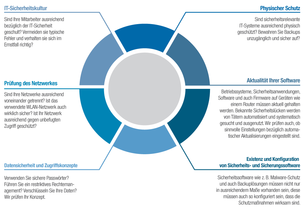 IT-Sicherheit erstreckt sich über viele Bereiche: von der gelebten Sicherheitskultur im Unternehmen über die korrekte Konfiguration von IT-Systemen, einschließlich der Nutzung und Pflege von sicherheitsrelevanten Komponenten, bis hin zur physischen Sicherheit der Systeme. Dabei fällt es schwer, immer den Überblick zu behalten.